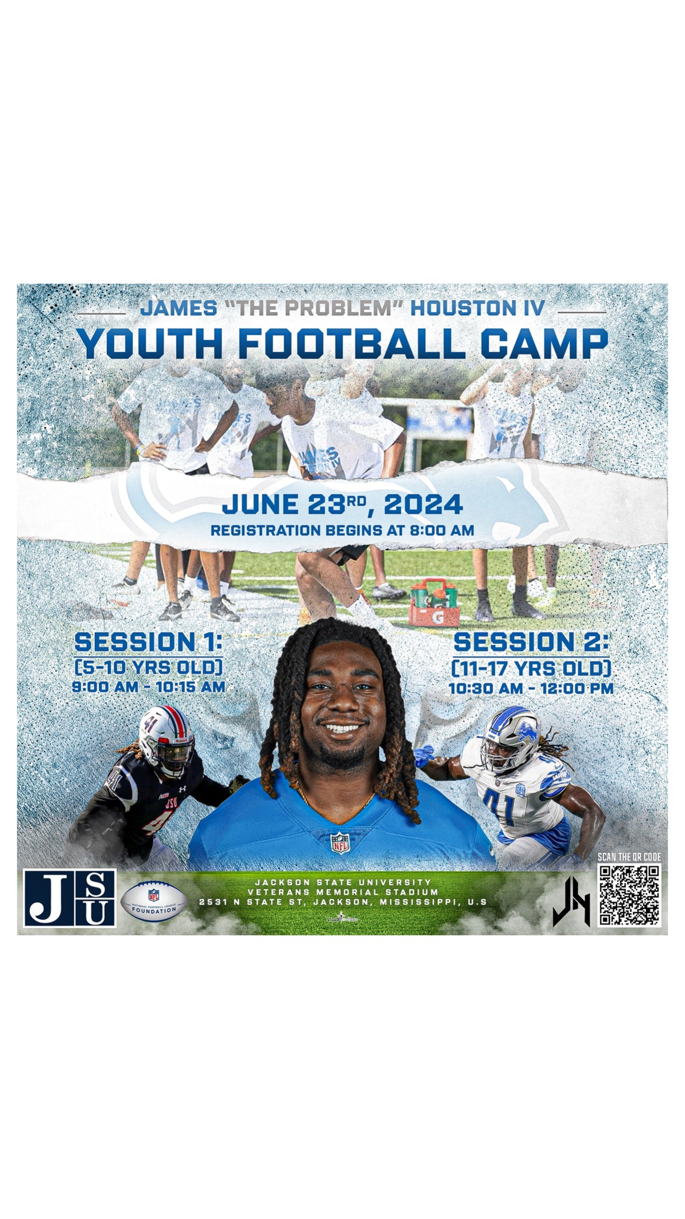The 2nd Annual James "The Problem" Houston IV Youth Football Camp is a free, non-contact camp for youth ages 5-17 at Jackson State University in Jackson, Mississippi. We aim to provide a positive and memorable football experience for every camper, coach, and parent. The camp will be a one-day event with two sessions and is expected to host over 200 young athletes. Don't forget to bring your cleats and come prepared to ball out!